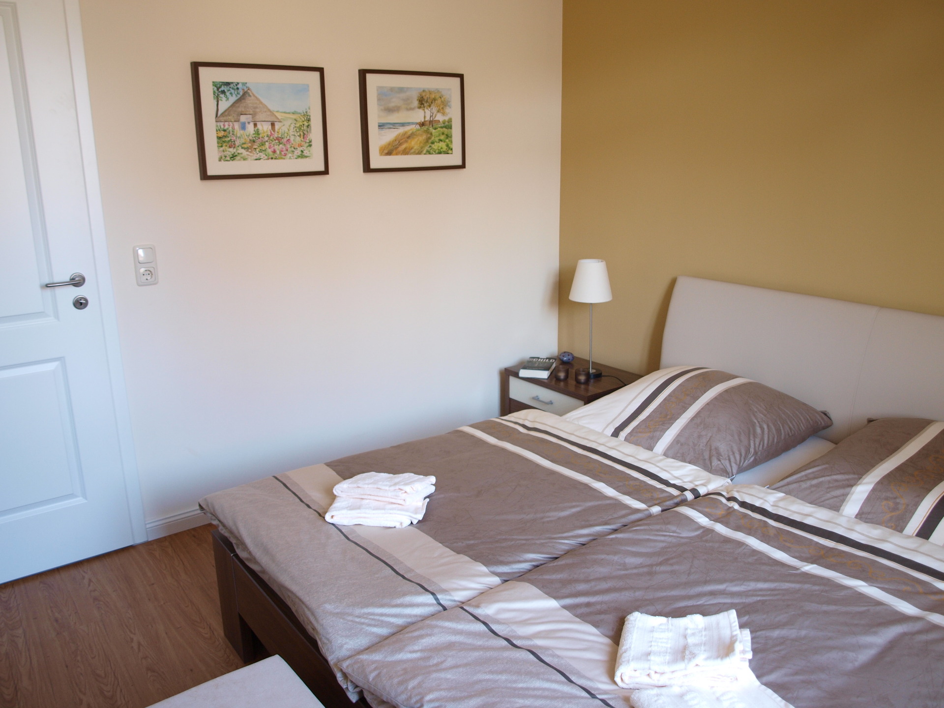 Das Schlafzimmer verfügt über ein großes Doppelbett, zwei Nachttischchen mit Leselampen und einen sehr geräumigen Schrank.